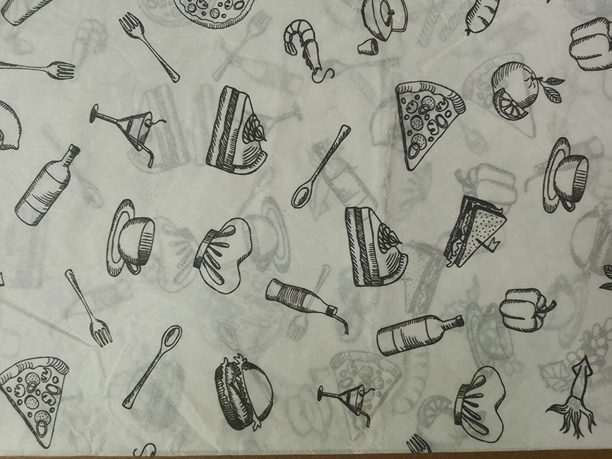 20-60GSM প্রিন্টেড লোগো সাইজ ফুড সেফ গ্রেড বার্গার পেপার র্যাপিং ওয়াক্স কোটেড পেপার